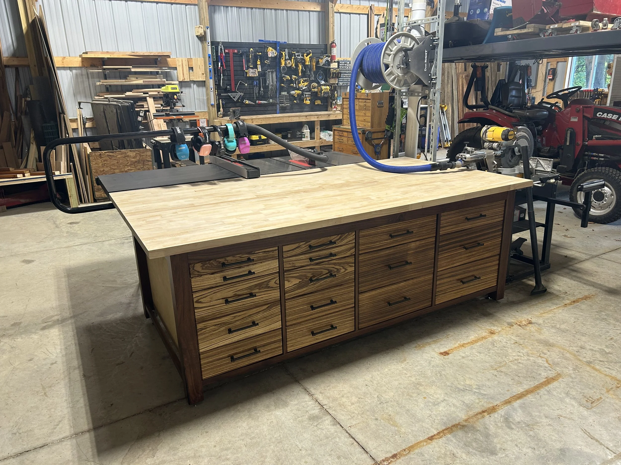 Workbench and Outfeed Table - Walnut frame, Maple top, and Zebrawood drawer faces.